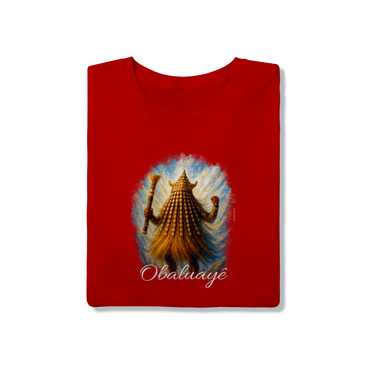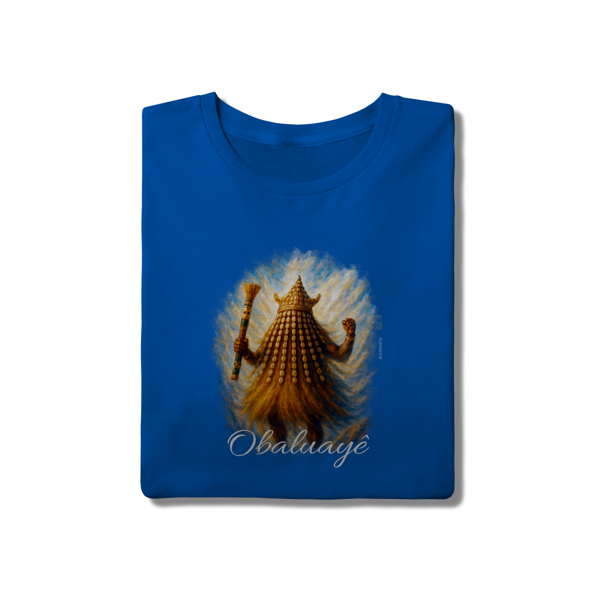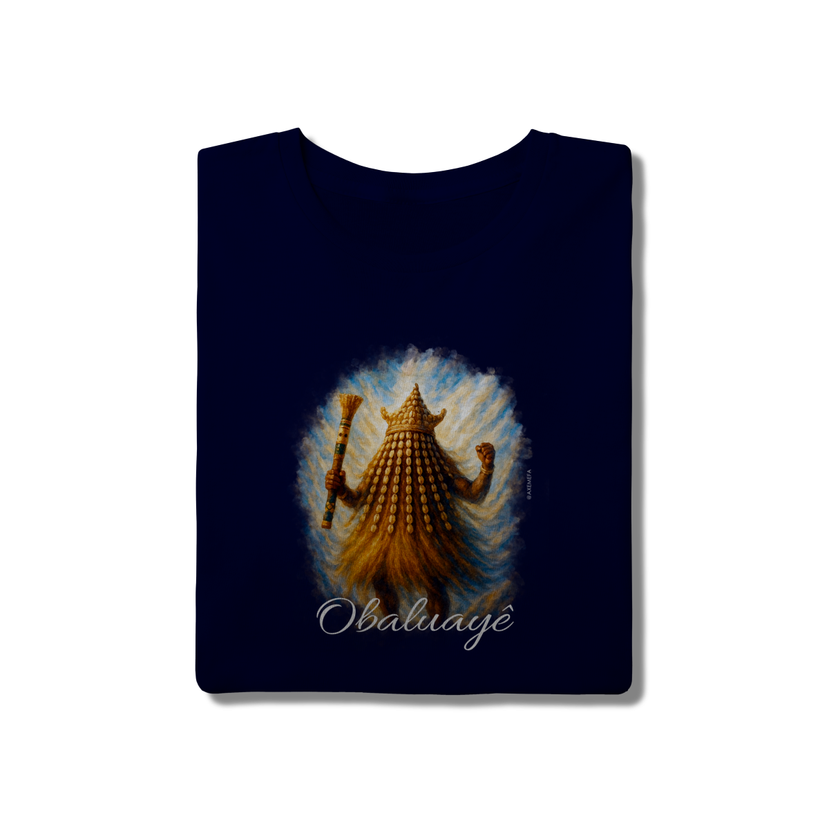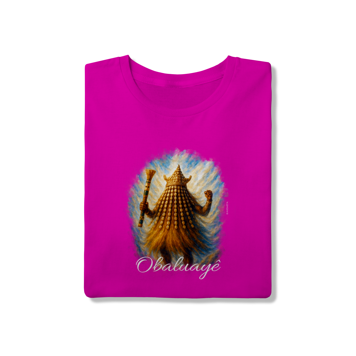 A estampa de Obaluaiye foi cuidadosamente desenvolvida por um Ilustrador profissional, capturando a energia desse orixá. Com cores vibrantes e detalhes precisos, ela garante um visual moderno e impactante.