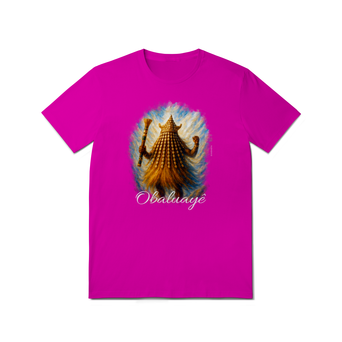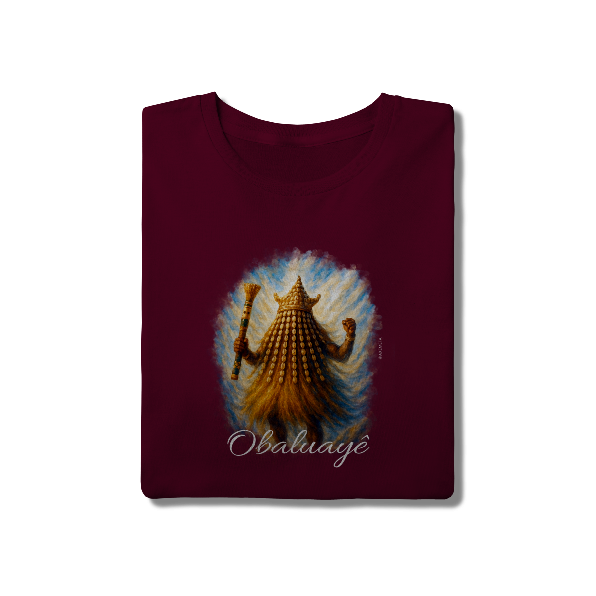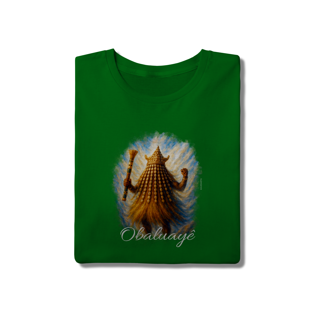 A estampa de Obaluaiye foi cuidadosamente desenvolvida por um Ilustrador profissional, capturando a energia desse orixá. Com cores vibrantes e detalhes precisos, ela garante um visual moderno e impactante.