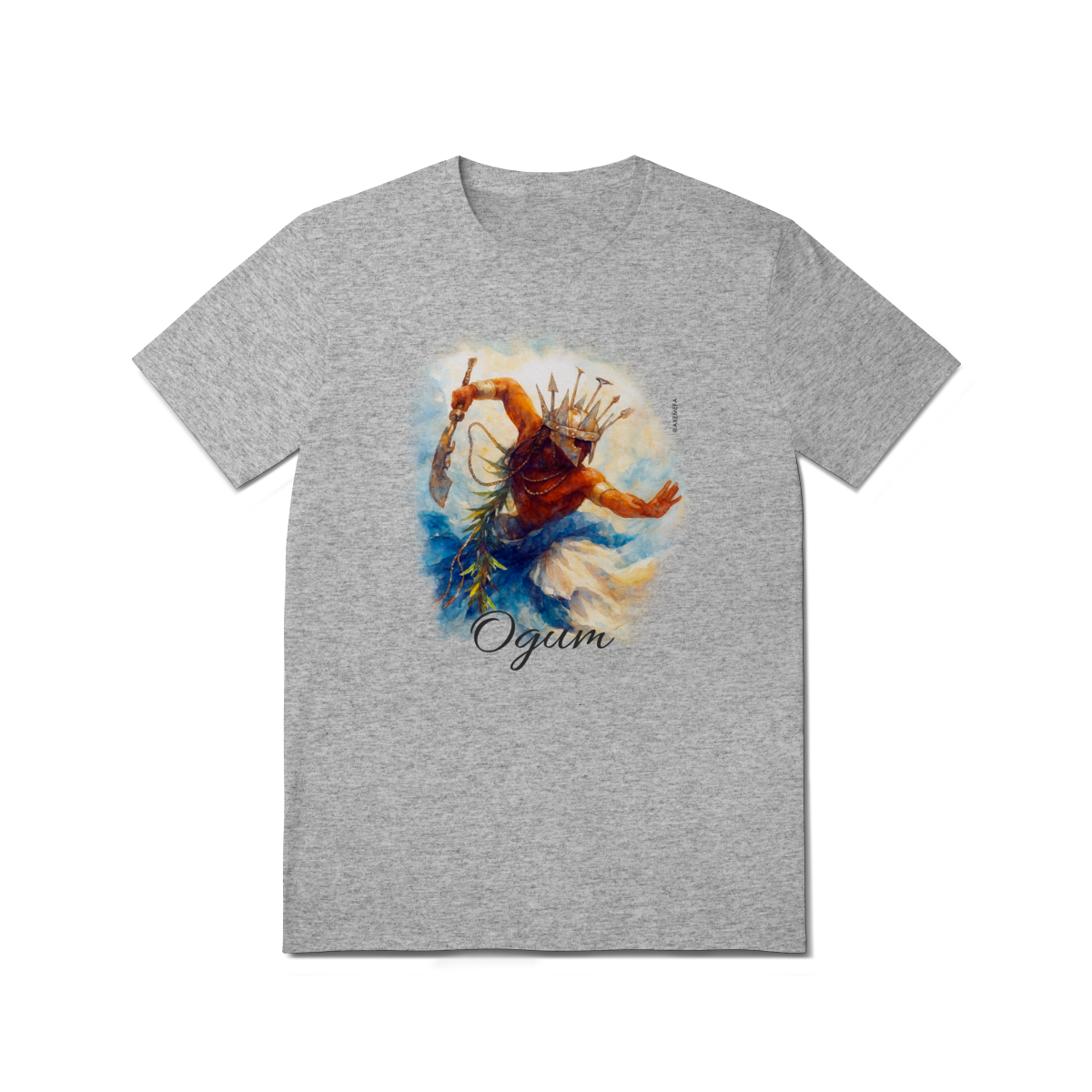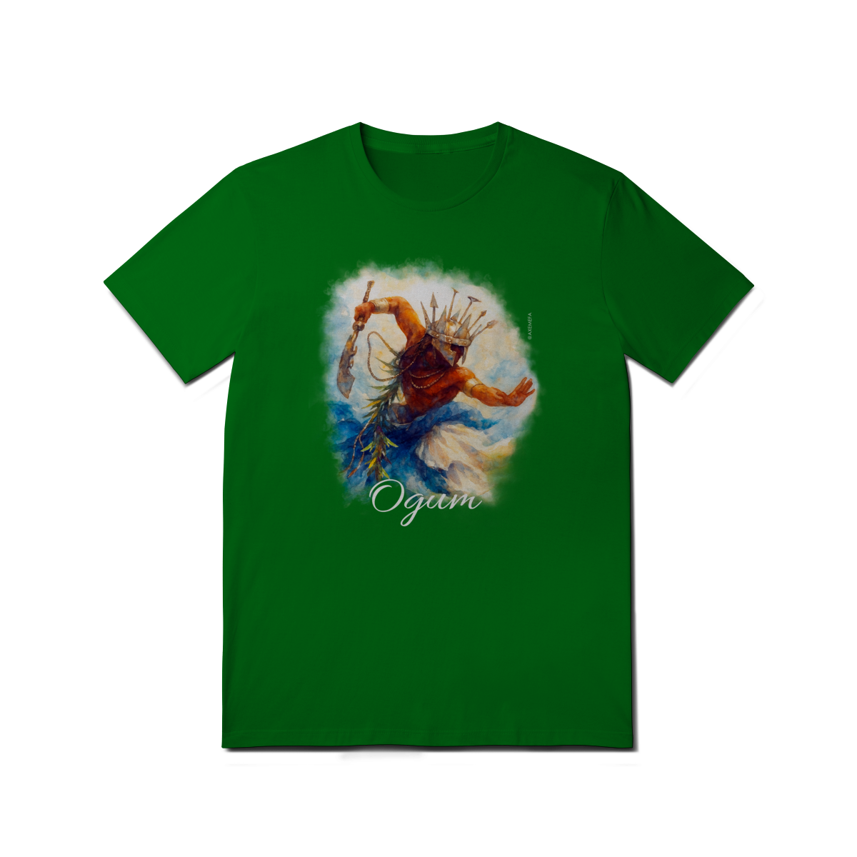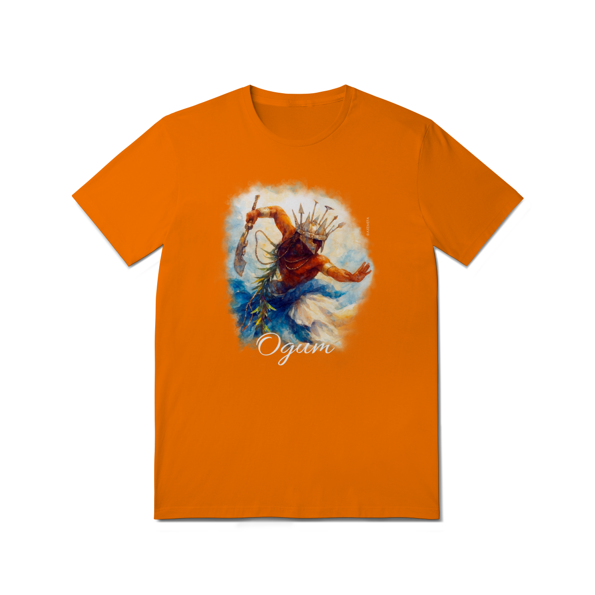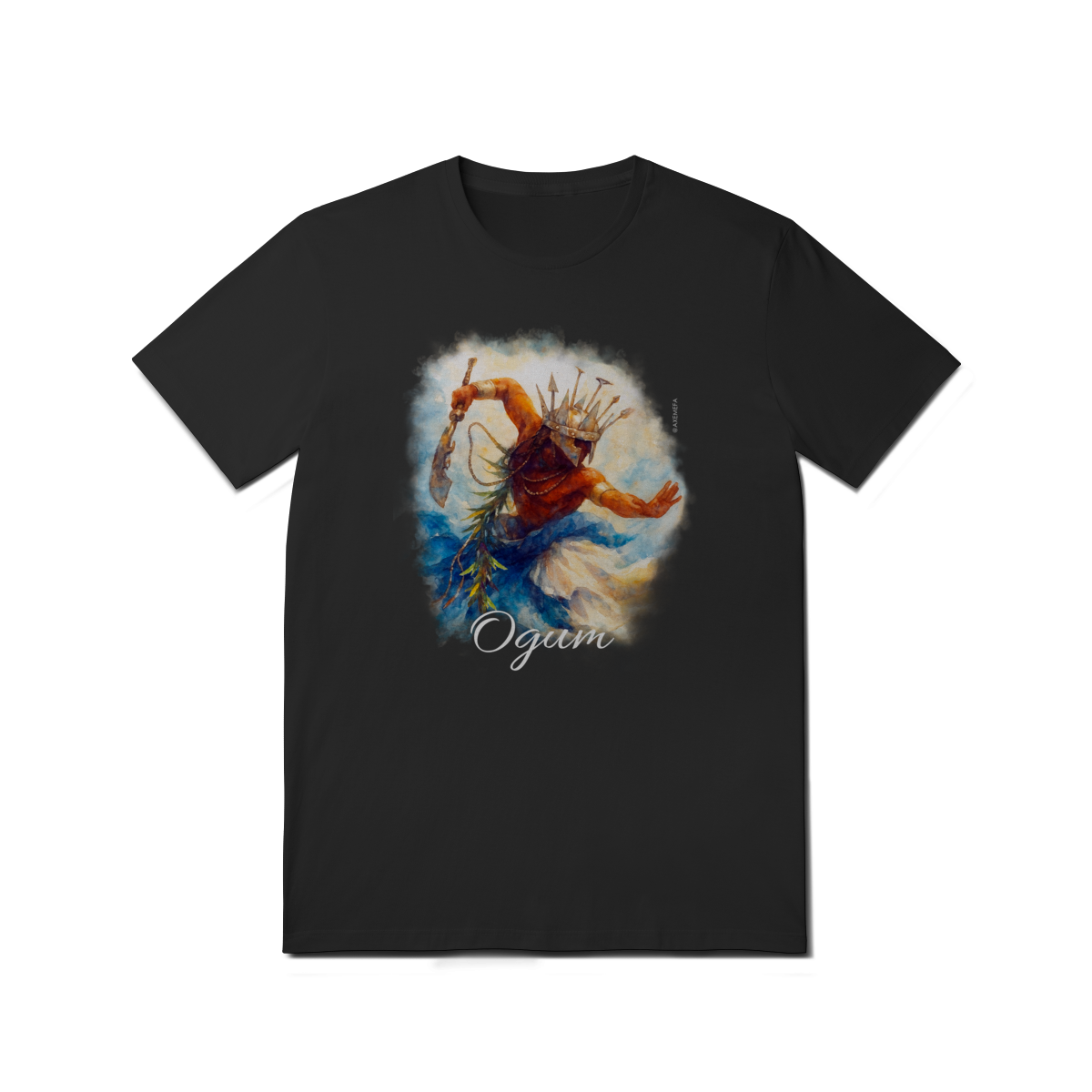 A estampa de Ogum foi cuidadosamente desenvolvida por um Ilustrador profissional, capturando a energia desse orixá. Com cores vibrantes e detalhes precisos, ela garante um visual moderno e impactante.