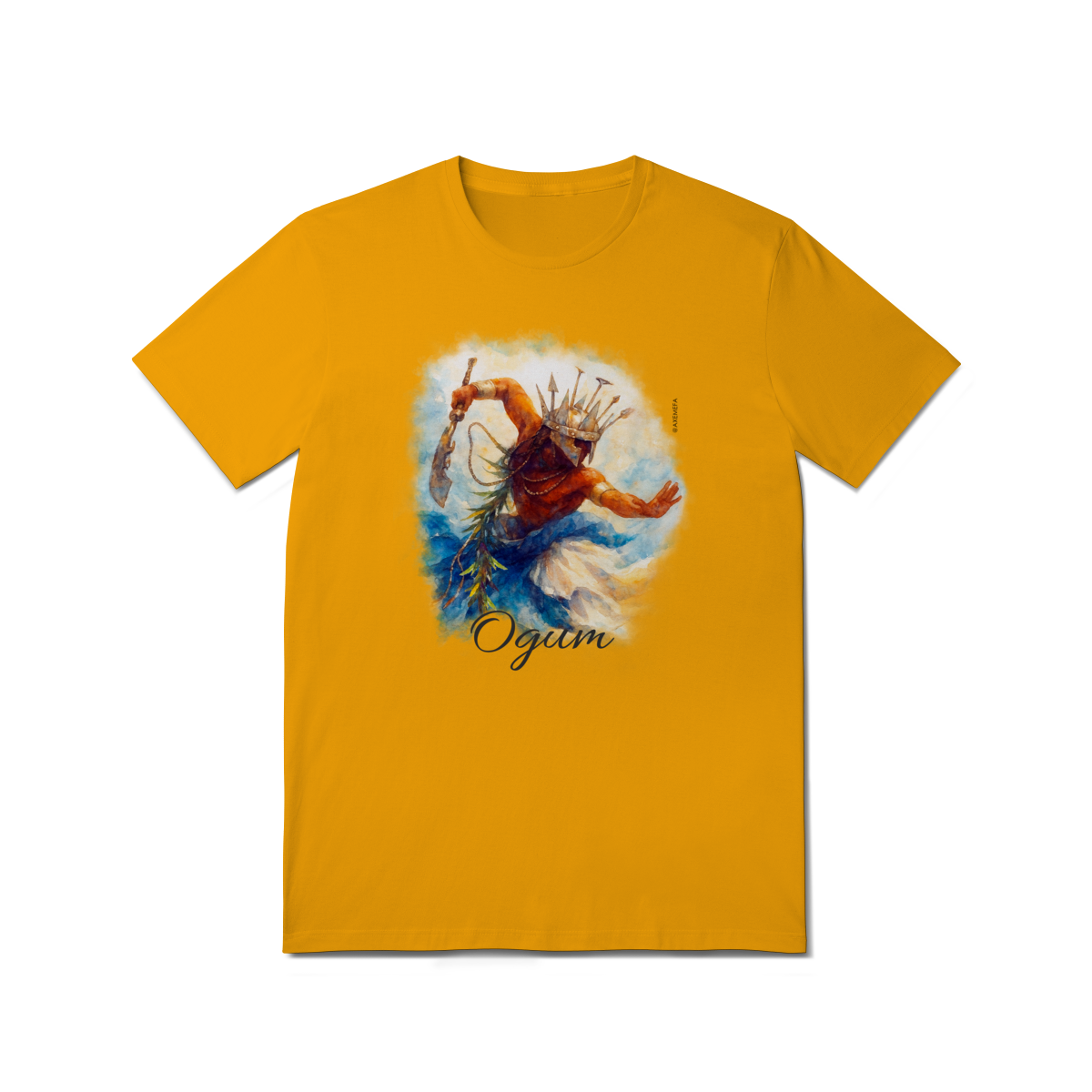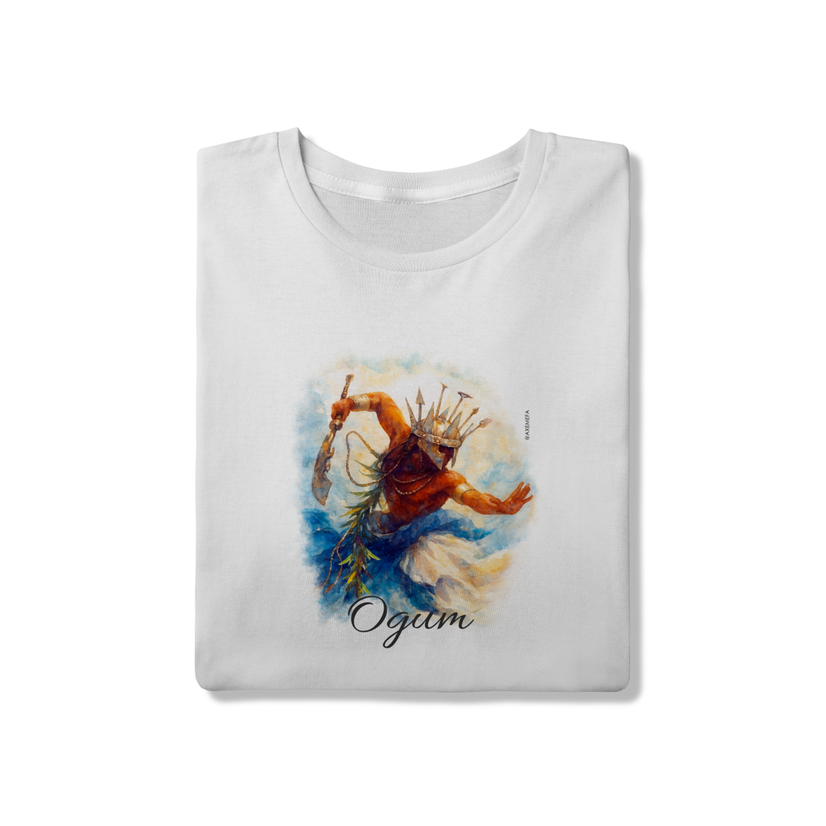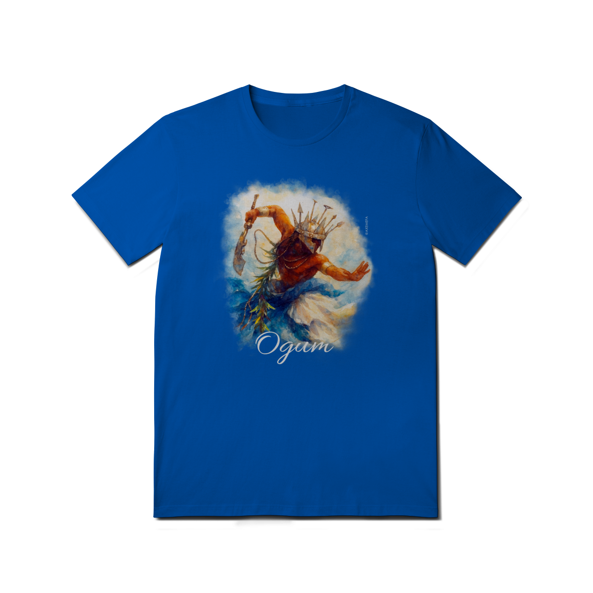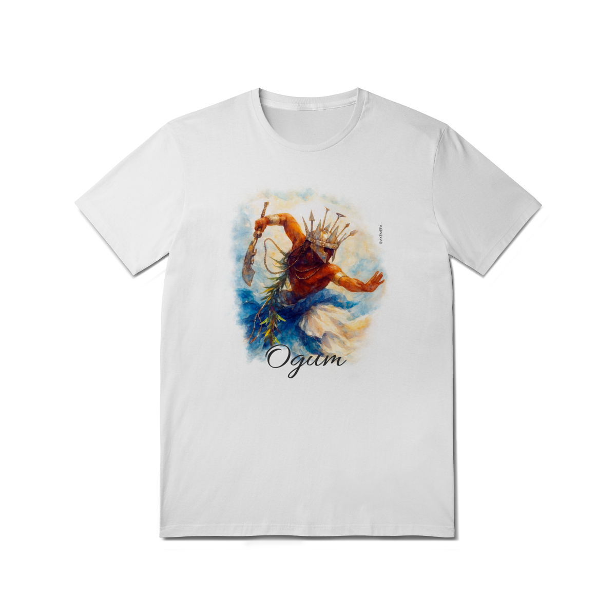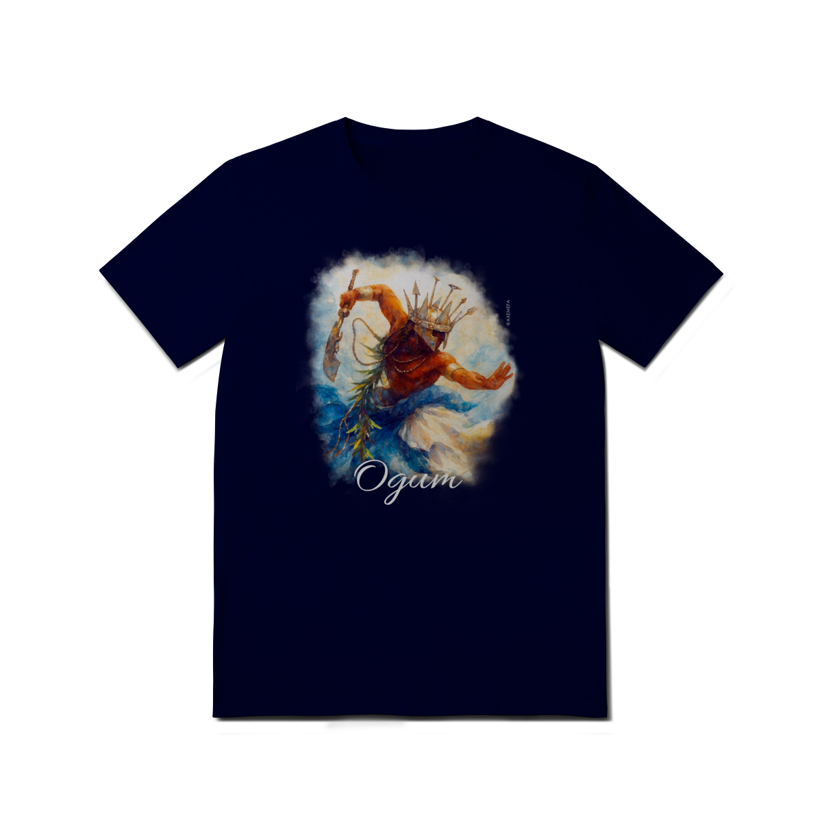 A estampa de Ogum foi cuidadosamente desenvolvida por um Ilustrador profissional, capturando a energia desse orixá. Com cores vibrantes e detalhes precisos, ela garante um visual moderno e impactante.